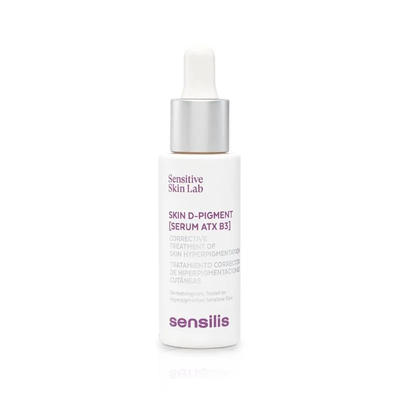SENSILIS Skin D-Pigment [Sérum Atx B3] es el primer sérum despigmentante eficaz en pieles sensibles hiperpigmentadas con un 2% de Ácido Tranexámico y un 10% de Niacinamida, por su acción despigmentante. Ideal para todo tipo de pieles hiperpigmentadas incluso fototipos oscuros, con melasma, cloasma o léntigos.