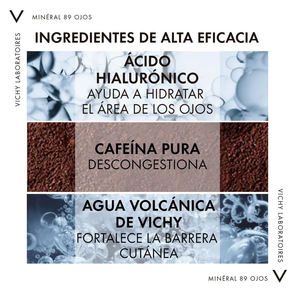 Minéral 89 contorno de ojos con ácido hialurónico hidrata, ilumina y suaviza las líneas de expresión alrededor del delicado contorno de los ojos. Esta fórmula, con una reconfortante crema en textura gel, combina un 89% de agua volcánica de Vichy, ácido hialurónico puro y cafeína para una mirada más luminosa y descansada.